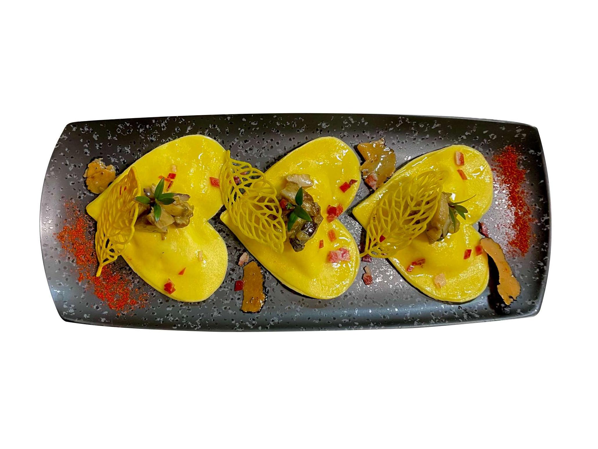 Tortelloni ripieni alla carbonara tartufata, chips di pancetta, crema di pecorino allo zafferano del Monte Baldo profumata al pepe affumicato