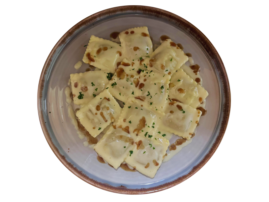 Ravioli all'uovo, ripieni con brasato di manzo al Teroldego Rotaliano Ravioli all'uovo, ripieni con brasato di manzo al Teroldego Rotaliano, conditi con vellutata al Trentodoc e il suo fondo.