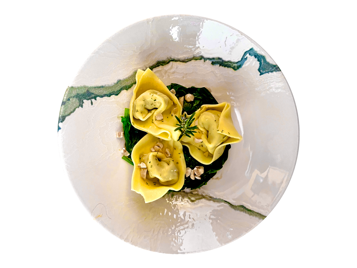 Tortelloni artigianali ripieni con topinambur, caprino cremoso e nocciole tostate, conditi con burro nostrano aromatizzato al rosmarino, adagiati su spinacini novelli profumati al pompelmo rosa.